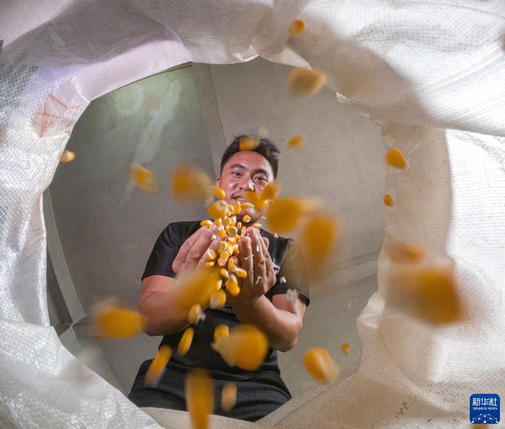7月31日,吳世榮在那坡縣百南鄉甲柳村上保屯查看玉米晾曬情況。新華社記者周華攝