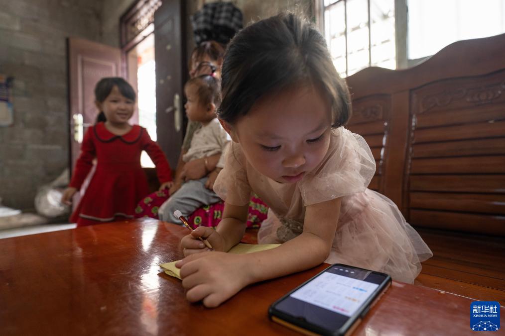 7月30日,陶文學(xué)剛上小學(xué)的妹妹在家中做假期作業(yè)。新華社記者費茂華攝