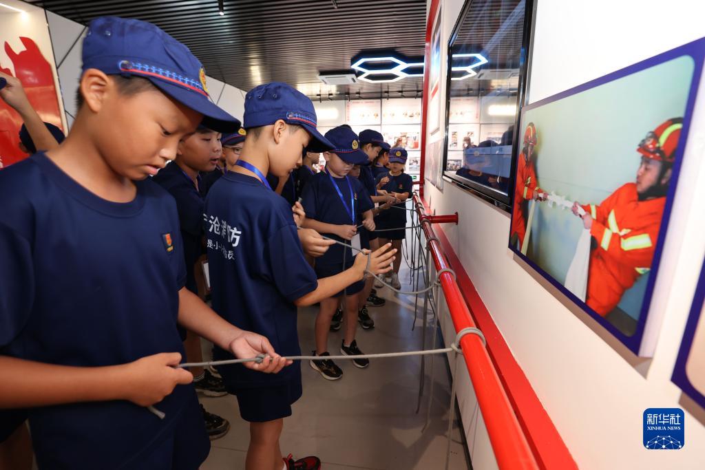 8月2日,在福建省廈門(mén)市消防科技教育館,小學(xué)生在學(xué)習救生結繩法。