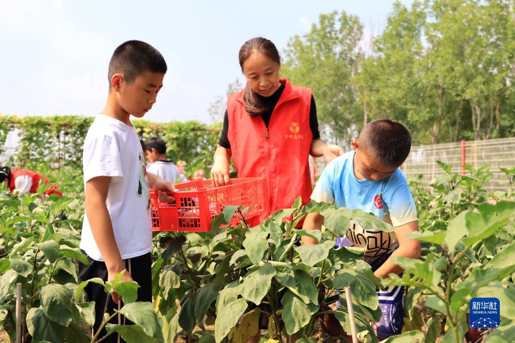 8月2日,在山東省聊城市茌平區胡屯鎮周莊小學(xué)勞動(dòng)實(shí)踐基地,孩子們和志愿者一起采摘蔬菜。