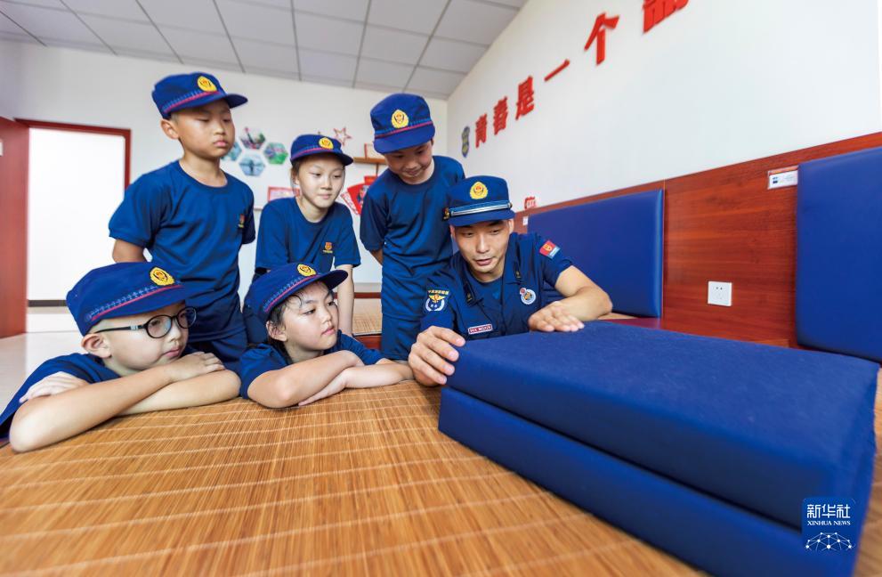 8月2日,在江西省永新縣消防救援大隊,消防員教孩子們疊“豆腐塊”被子。
