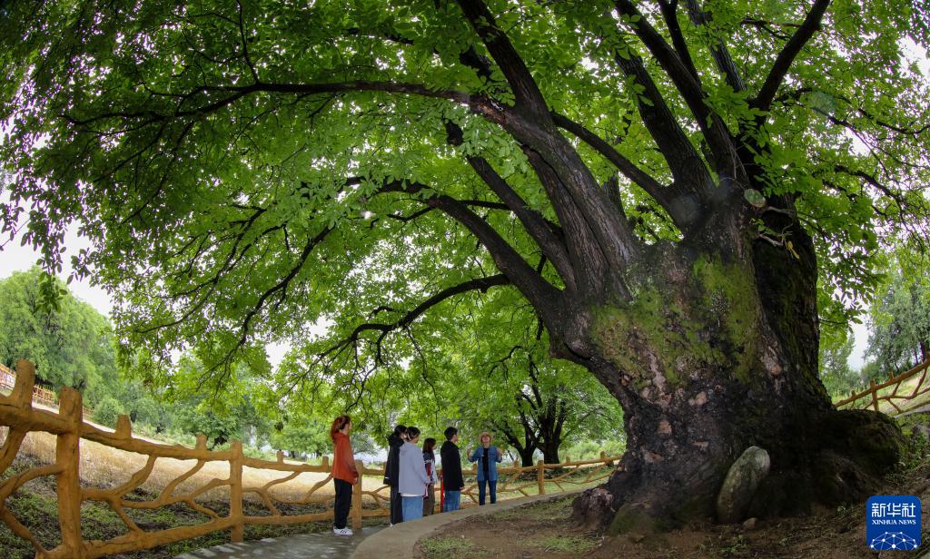 劉利平博士(右一)在加查縣安繞鎮熱果村一株樹(shù)齡1800余年的古核桃樹(shù)下指導學(xué)生(7月27日攝)。