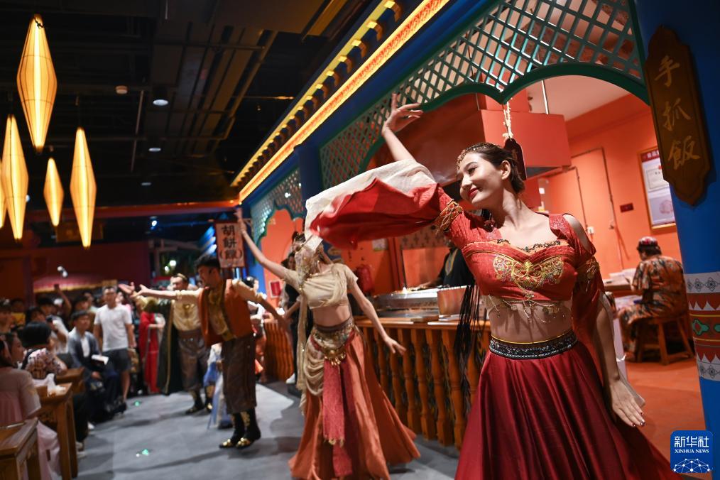 8月2日,游客在長(cháng)安十二時(shí)辰主題街區觀(guān)看唐風(fēng)演藝《胡姬酒肆》。