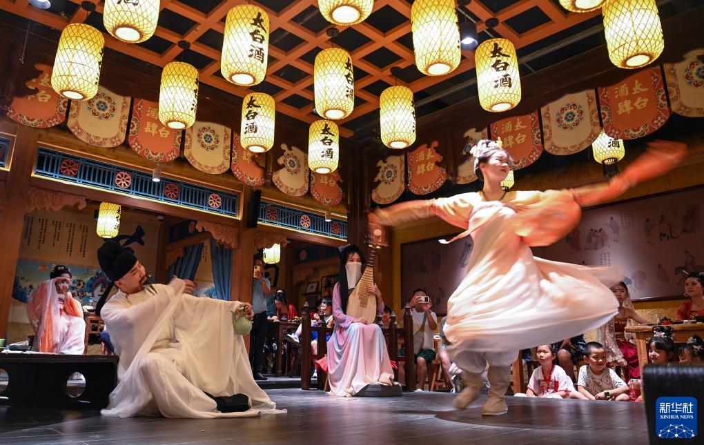 8月2日,游客在長(cháng)安十二時(shí)辰主題街區觀(guān)看唐風(fēng)演藝《將進(jìn)酒》。