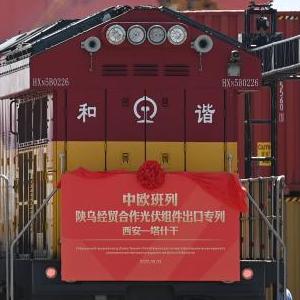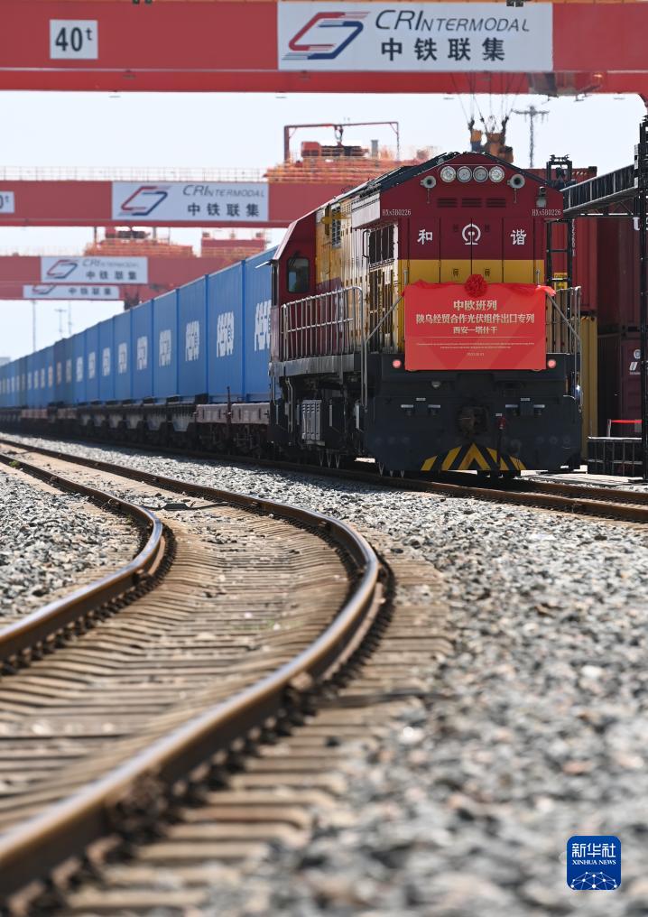 當日,中歐班列(西安-塔什干)陜?yōu)踅?jīng)貿合作隆基綠能光伏組件出口專(zhuān)列首發(fā)儀式在西安國際港站舉行,裝載光伏組件的中歐班列“長(cháng)安號”駛向烏茲別克斯坦,助力當地新能源項目建設。
