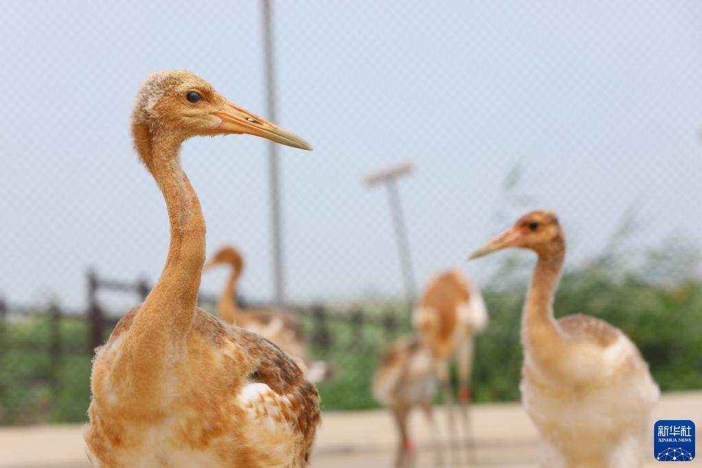 8月3日,丹頂鶴雛鳥(niǎo)在保護站內活動(dòng)。
