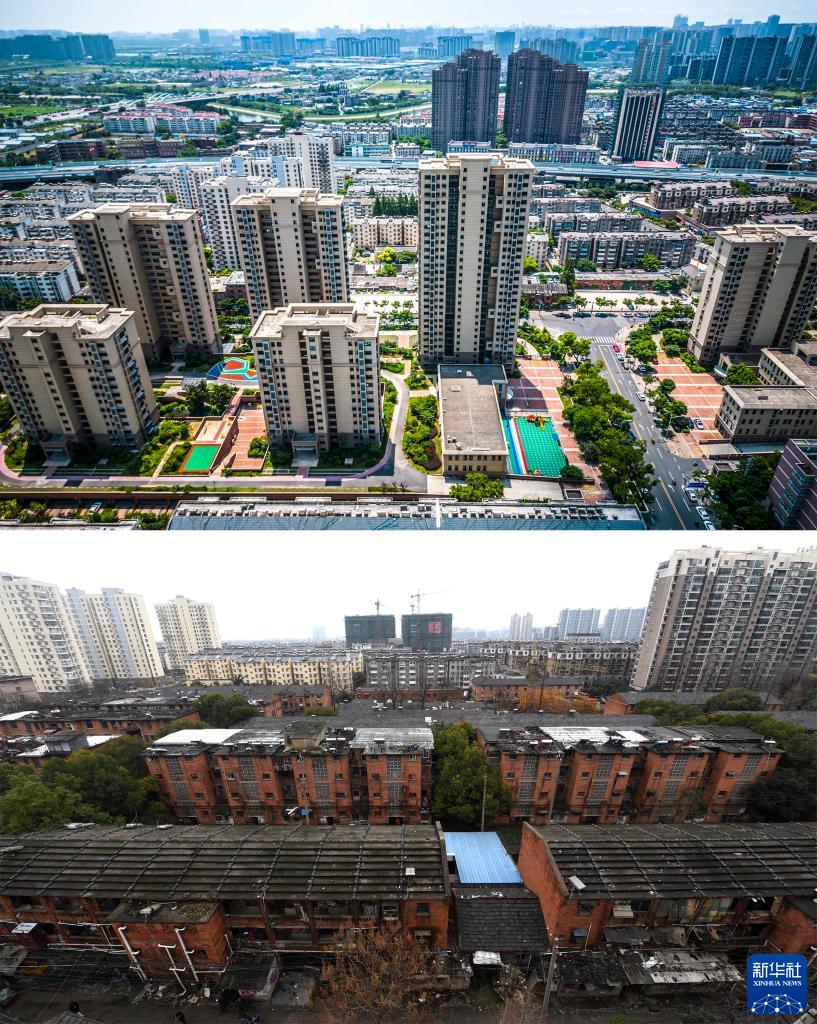 拼版照片:上圖為2023年8月3日拍攝的改造后的合肥市瑤海區安拖東村及新莊城中村改造項目(無(wú)人機照片);下圖為2015年3月拍攝的未改造前的安拖東村及新莊城中村舊貌。