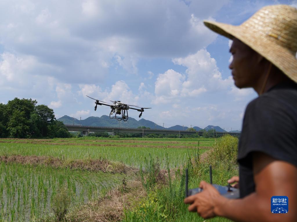 江西省新余市分宜縣的農戶(hù)操作無(wú)人機噴灑葉面肥(8月3日攝)。