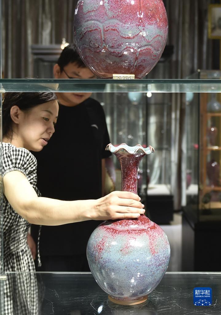 8月3日,河南省禹州市神垕鎮一家鈞瓷企業(yè)的工作人員在展廳里向來(lái)訪(fǎng)者介紹鈞瓷作品。