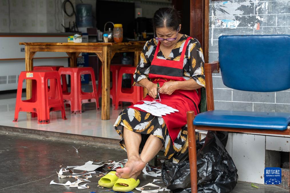 8月2日,在靖西市舊州村,一名開(kāi)飯館的村民在制作繡球。