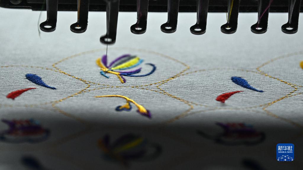 在靖西市非遺傳承人王秀芬繡球制作車(chē)間,機器在繡花(8月2日攝)。