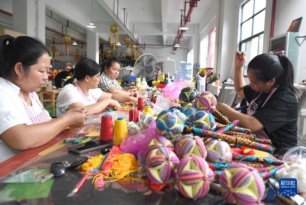 工人在靖西市繡蘊坊繡球文化有限公司制作繡球燈(8月2日攝)。