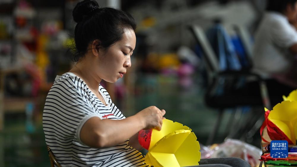 在靖西市非遺傳承人王秀芬繡球制作車(chē)間,一名繡娘在制作繡球內襯(8月2日攝)。