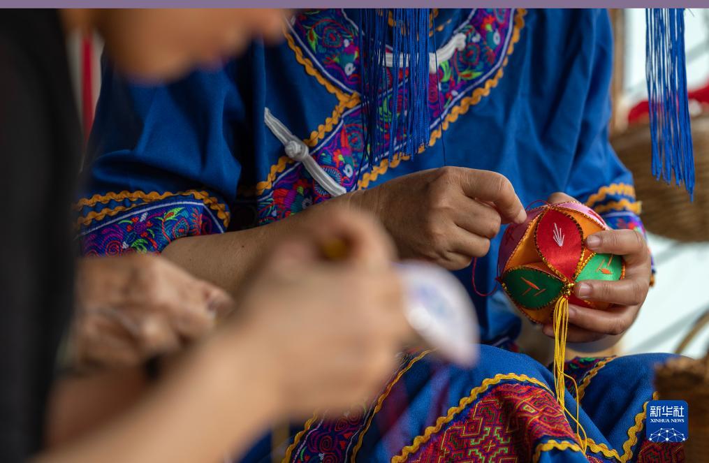8月2日,在靖西市舊州村,村民在制作繡球。