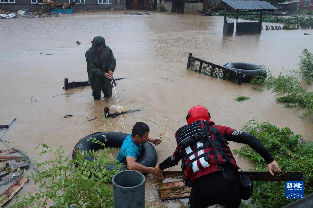 8月4日,在尚志市一面坡鎮萬(wàn)山村,哈爾濱市森林消防支隊的消防員正在解救被困村民。