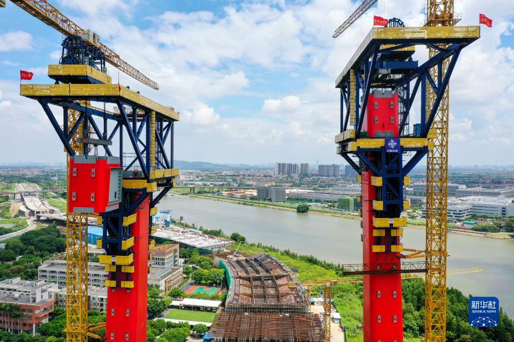 智能鋼塔提升機在吊裝順德大橋東主塔鋼節段(無(wú)人機照片,8月4日攝)。