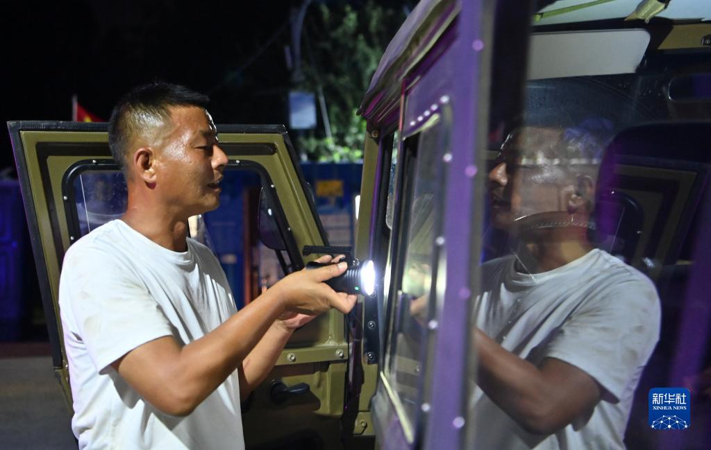 郝慶水從車(chē)內取出手電筒準備去巡視河堤(8月3日攝)。