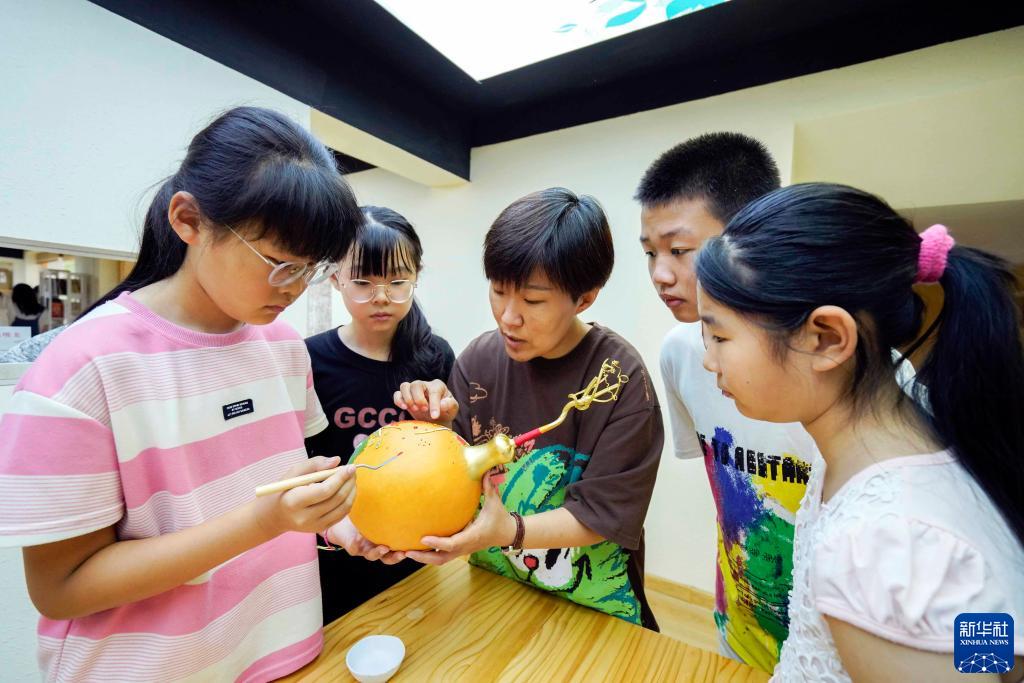 8月4日,民間藝人在河北省遵化市一公益培訓班指導孩子們創(chuàng )作葫蘆畫(huà)。