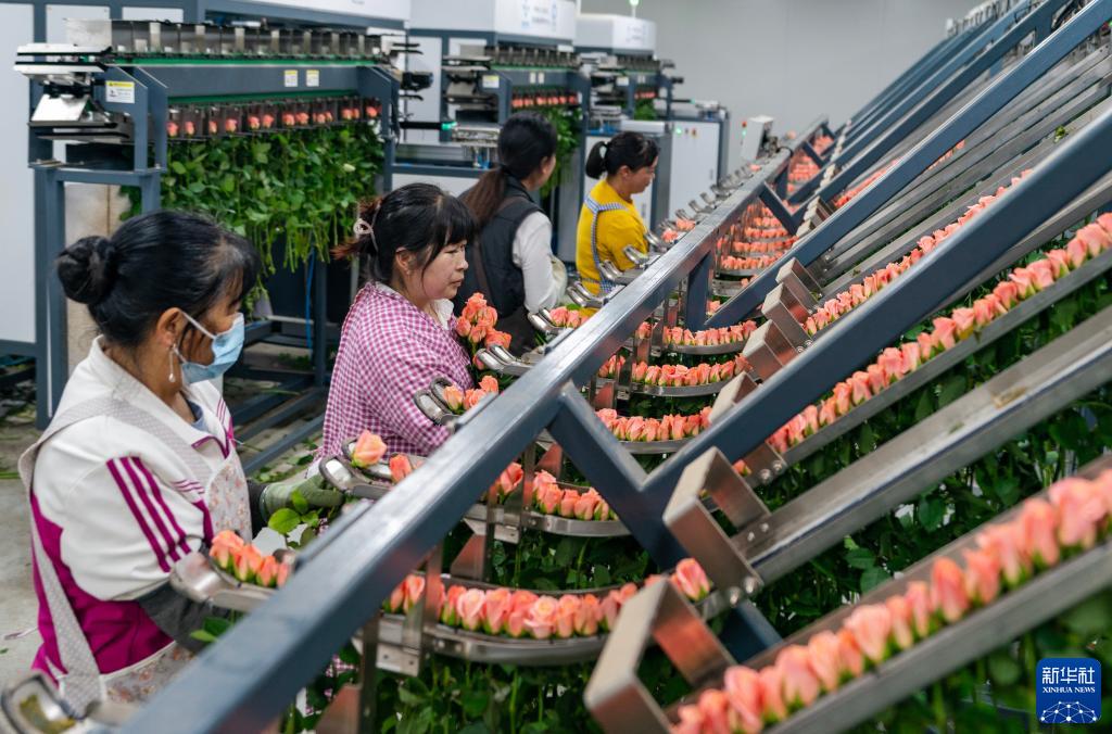 在云天化晉寧花卉產(chǎn)業(yè)現代化示范園內,花農們將鮮切花自動(dòng)分揀流水線(xiàn)上分揀好的鮮花取下,準備放入包裝流水線(xiàn)(7月12日攝)。新華社記者 陳欣波 攝