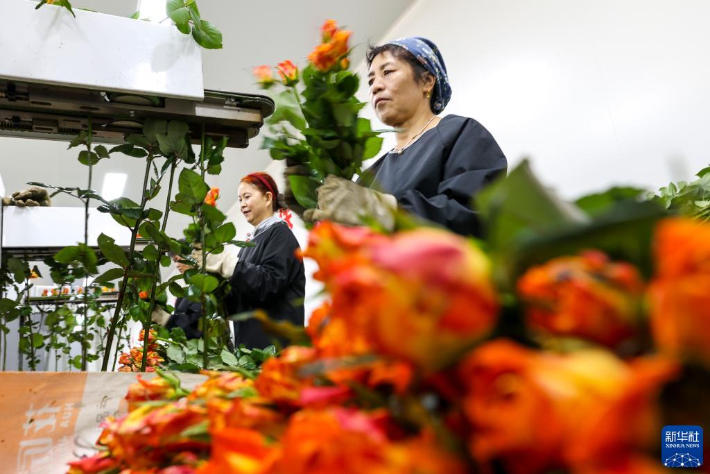 在云天化晉寧花卉產(chǎn)業(yè)現代化示范園內,花農們將預冷處理后的鮮花放入自動(dòng)分揀流水線(xiàn)(7月12日攝)。新華社記者 崔文 攝