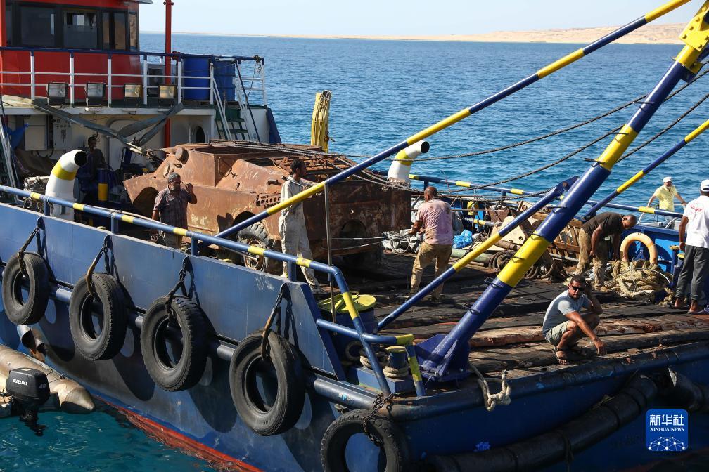 8月3日,在埃及胡爾加達附近水域,人們準備將一輛廢棄的裝甲車(chē)沉入海底特定區域。