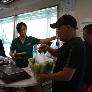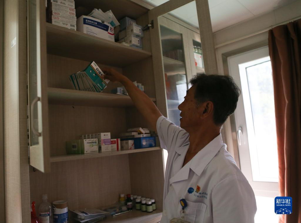 8月4日,在綜合服務(wù)區的“健康小家”,值班醫生周立明在介紹常備的藥品。