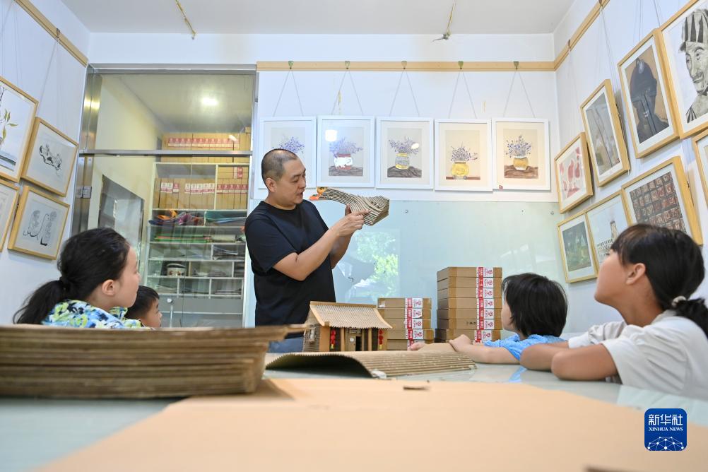 在位于山西省太原市萬(wàn)柏林區的工作室內,王帥棟和小朋友們分享瓦楞紙作品背后的地理知識(8月4日攝)。