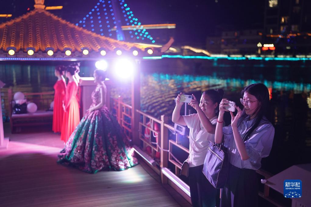 8月3日,游客在嵐皋縣縣城嵐河的游船上游覽拍照。