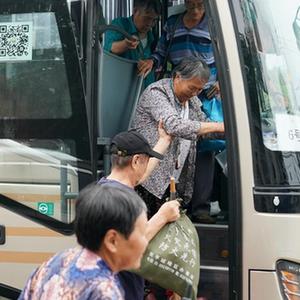 8月5日,北京市房山區青龍湖鎮口頭村村民在安置點(diǎn)登上接他們回家的大巴。