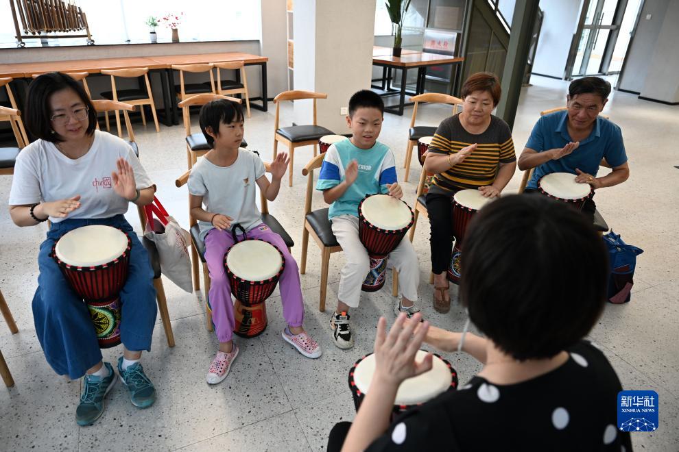 8月5日,市民在藝術(shù)課堂上學(xué)習非洲鼓演奏。