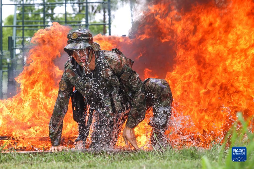 陸軍第72集團軍某旅組織官兵進(jìn)行極限課目訓練,一名戰士穿越火障(7月30日攝)。