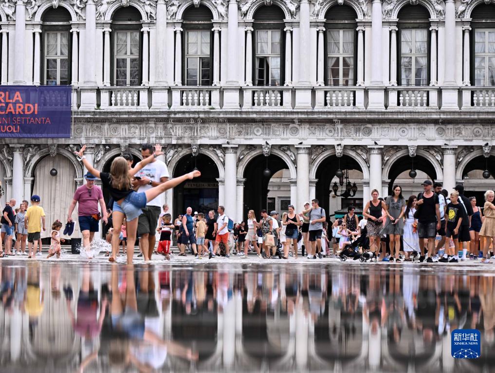 8月4日,游客聚集在意大利威尼斯積水的圣馬可廣場(chǎng)。