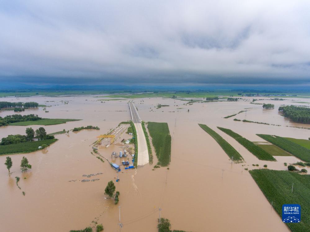 黑龍江省哈爾濱市延壽縣部分農田和道路被淹(8月5日攝,無(wú)人機照片)。