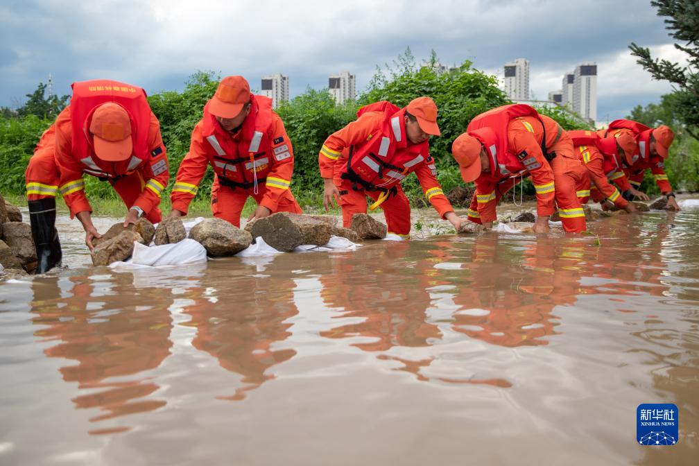 8月5日,在牡丹江市東安區大灣村附近,牡丹江市森林消防支隊的消防員搬運石頭封堵洪水。