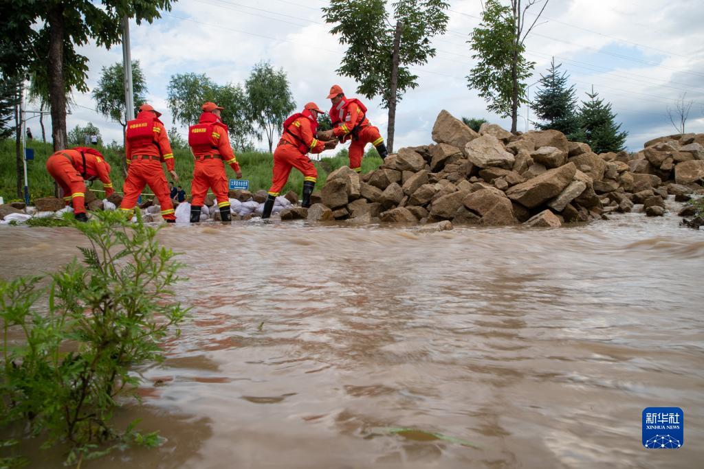 8月5日,在牡丹江市東安區大灣村附近,牡丹江市森林消防支隊的消防員搬運石頭封堵洪水。