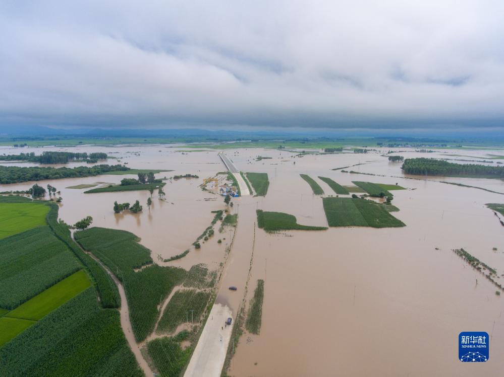 黑龍江省哈爾濱市延壽縣部分農田和道路被淹(8月5日攝,無(wú)人機照片)。