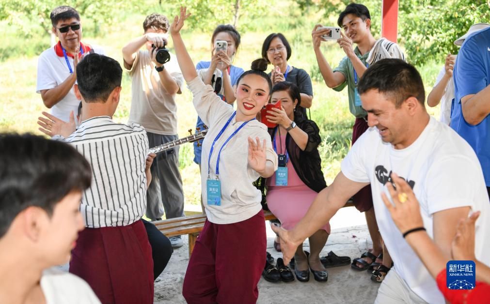 泰國藝術(shù)發(fā)展學(xué)院舞蹈團的演員和中國新疆藝術(shù)劇院木卡姆藝術(shù)團的演員一起跳舞(7月24日攝)。