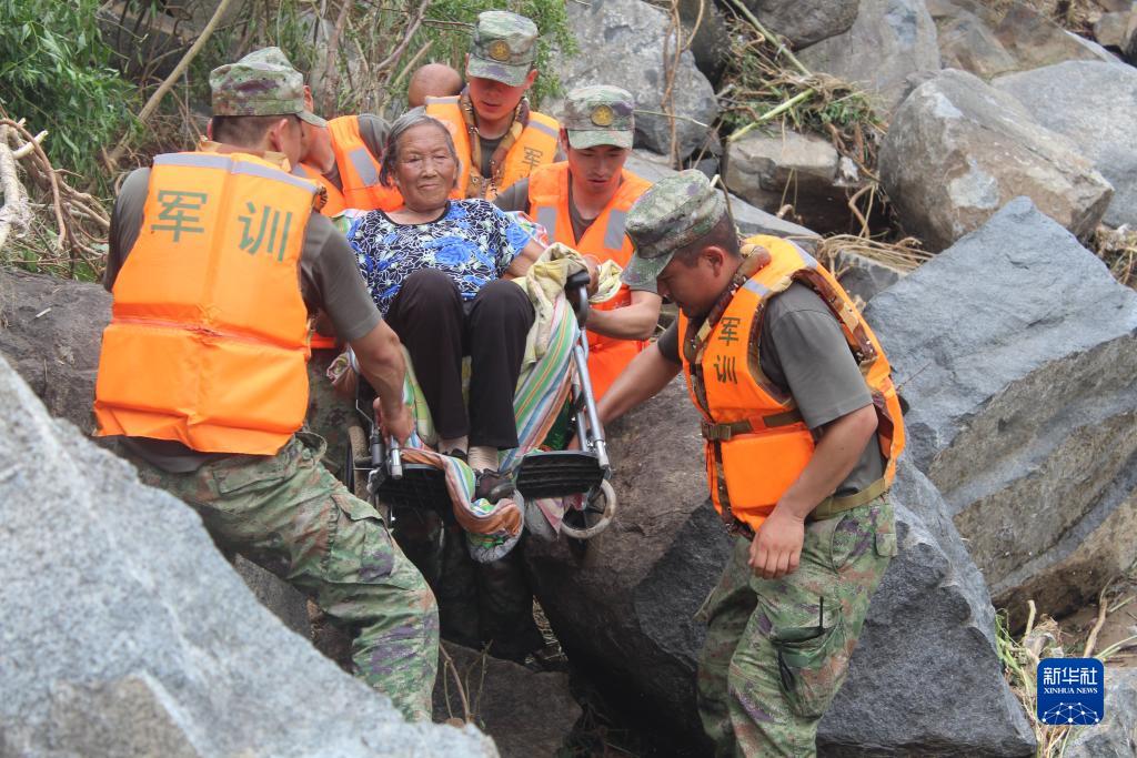 陸軍第81集團軍某旅搜救隊官兵在冀西北受災地區轉移胯骨受傷的老人通過(guò)險灘(8月2日攝)。新華社發(fā)(王金超 攝)