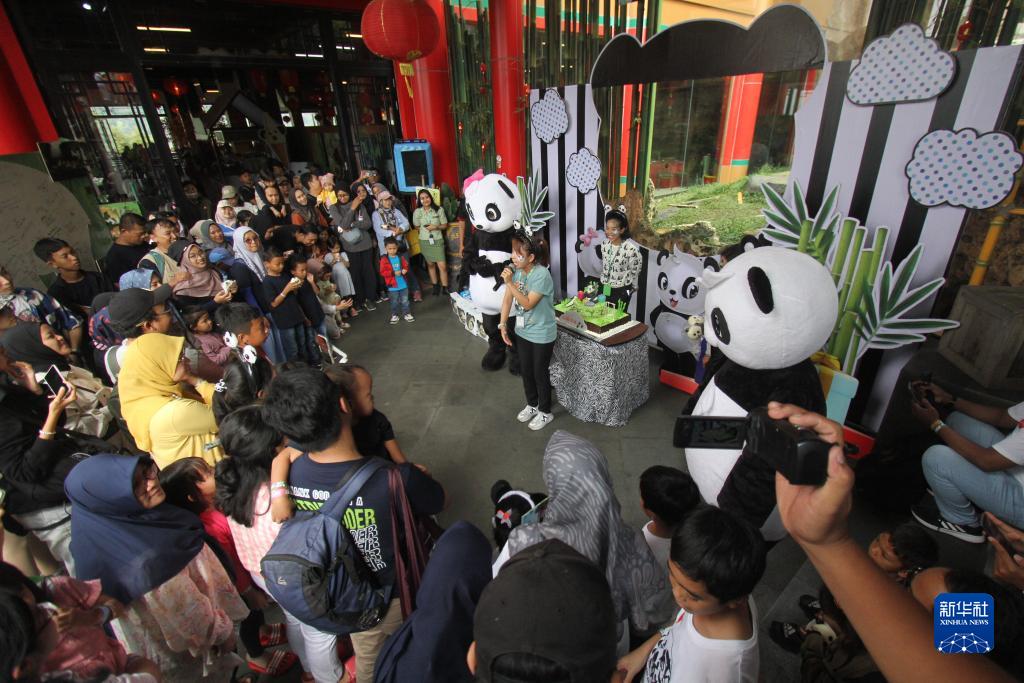 8月5日,在印度尼西亞茂物的印尼野生動(dòng)物園,人們參加大熊貓“彩陶”的生日慶祝儀式。