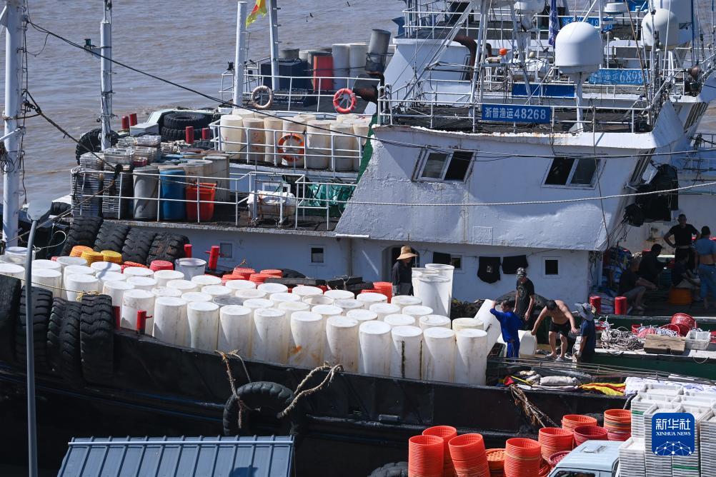 8月6日,停泊在舟山普陀沈家門(mén)漁港的漁船上的漁民們在為當天的開(kāi)漁做準備工作。