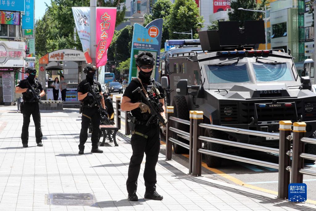 8月6日,全副武裝的特警在韓國釜山街頭巡邏。