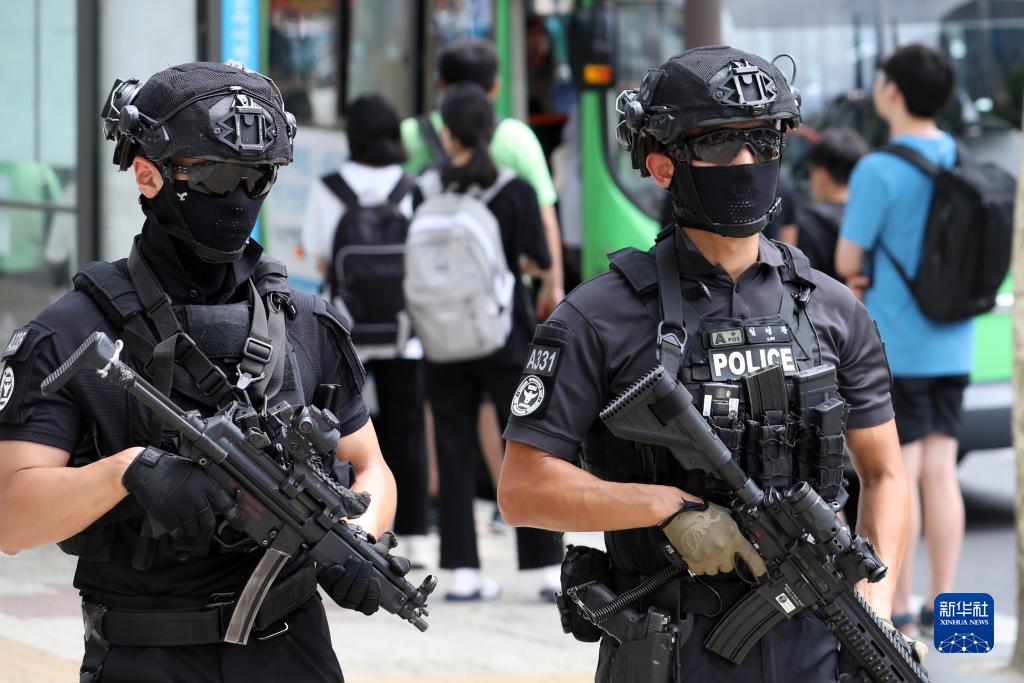 8月6日,全副武裝的特警在韓國首爾江南區街頭巡邏。