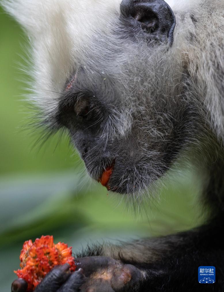 一只白頭葉猴在吃構樹(shù)的果實(shí)(8月4日攝)。