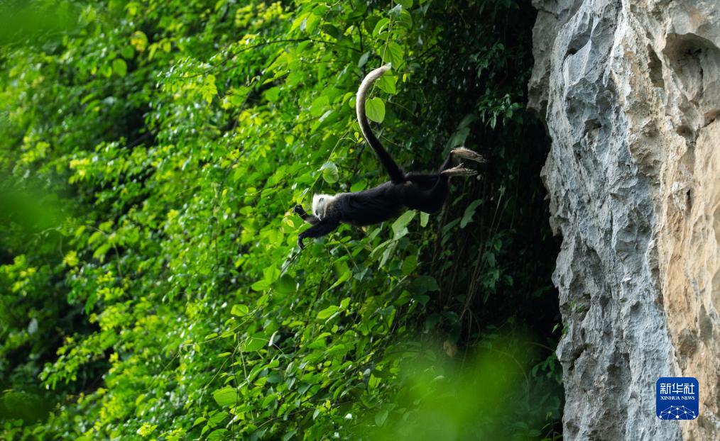 一只白頭葉猴從懸崖上躍向樹(shù)林(8月5日攝)。