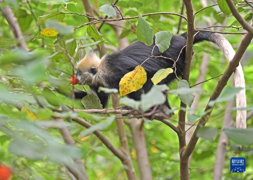 一只白頭葉猴在吃構樹(shù)的果實(shí)(8月4日攝)。