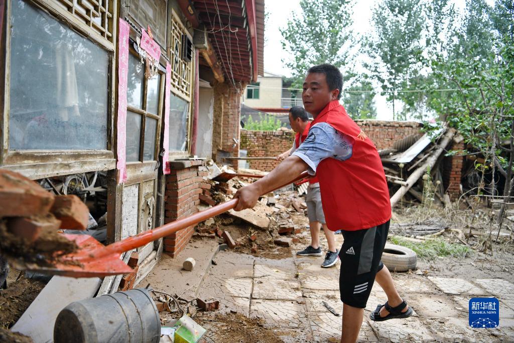 8月6日,在河北省涿州市刁窩鎮白塔村,志愿者在一處遭受洪水毀壞的房屋前清理雜物。