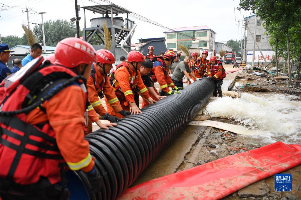 8月6日,在河北省涿州市刁窩鎮東張村,唐山消防救援支隊隊員在進(jìn)行排澇作業(yè)。