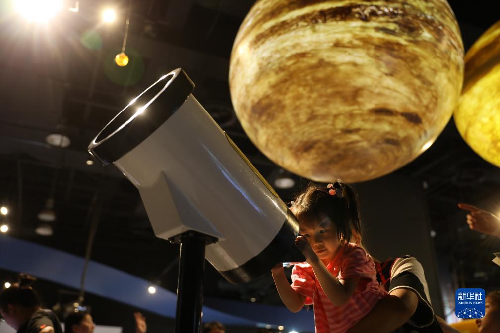 8月6日,一名小朋友在位于沈陽(yáng)市的遼寧省科技館里體驗望遠鏡。