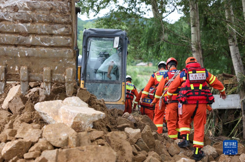 8月6日,吉林市消防救援支隊隊員徒步穿過(guò)坍塌的道路前往受困人員位置。
