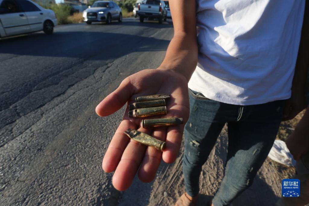 8月6日,一名男子在約旦河西岸城市杰寧的事發(fā)地點(diǎn)展示彈殼。